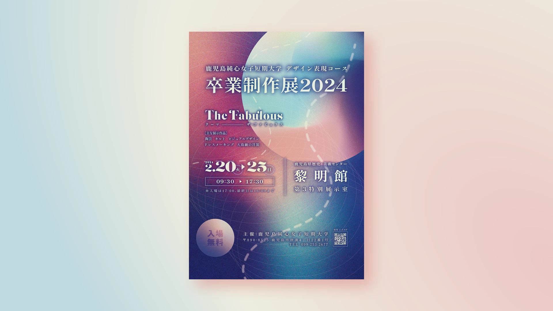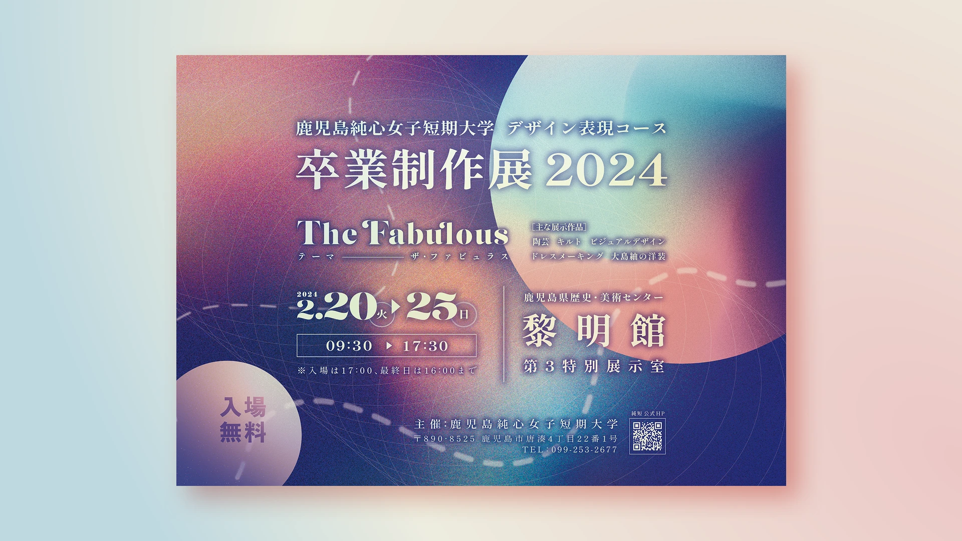 自身が所属していた短大のコースが開催した卒業制作展にて使用されたメインビジュアルの制作を行いました。この展示会のテーマである「fabulous」というワードから、参加する学生の「作品を広く共有したい」という意思の強さと壮大さを連想し、メインビジュアルに表現しました。